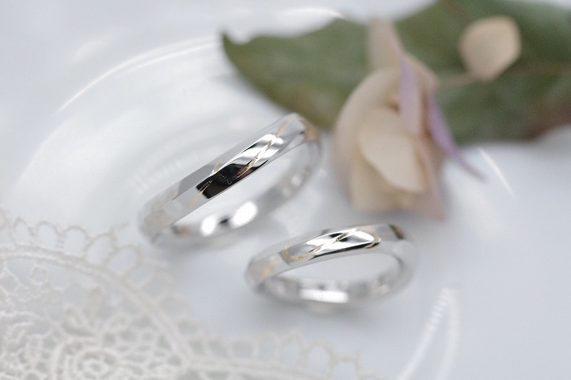 S字にウェーブしたハードプラチナのリングの表面に、イエローゴールドで模様を流し込んだ指輪です。表面はフラットで着けやすいデザインになっております。お二人共同じカーブをお選びになったので、綺麗に重なる指輪になっております。
