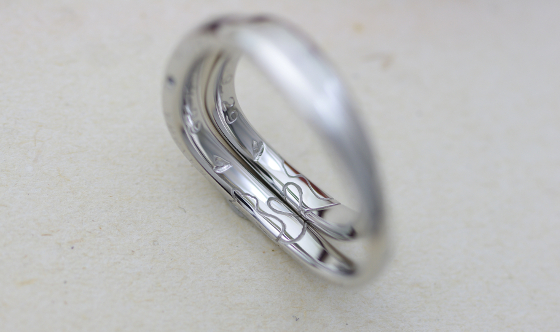内側と側面の2面を使用し彫り込んだ猫の尻尾が、2本の指輪を重ねるとハートになります。