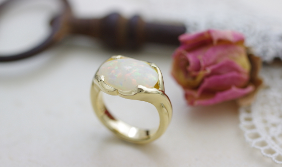 繊細なお石のオパールが大き目なので、お石も保護しつつお客様のお好みのデザインに仕上がるようデザインをご提案させて頂きました。
