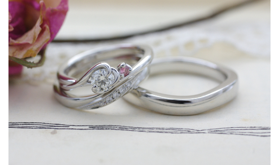 婚約指輪…サイドストーンのピンクダイヤはとても美しく目を惹くお色のしっかりしたものを選んで頂きました。