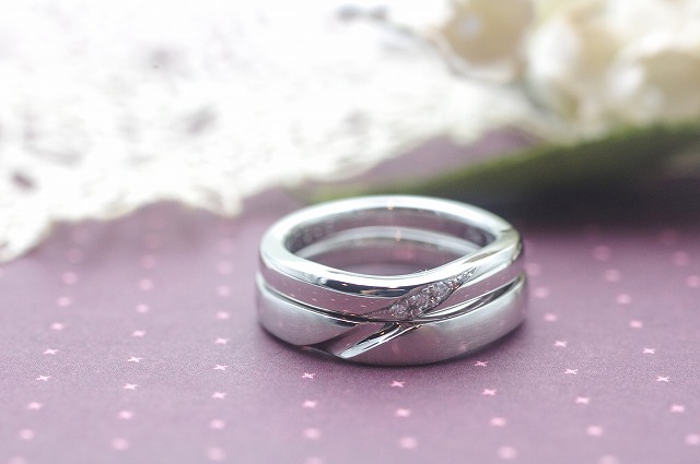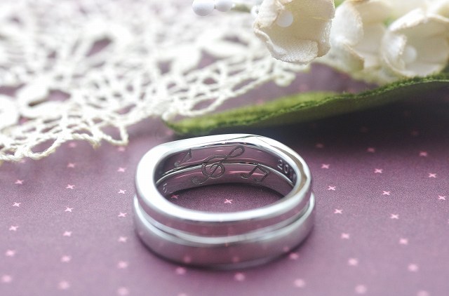 音楽を通じで知り合ったというお2人。重厚感のあるリングに、内側には楽しい雰囲気に音符が彫られました。表面にもレディース、メンズが繋がる様ラインを施し、レディースにはダイヤを留めました。