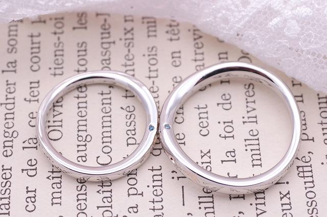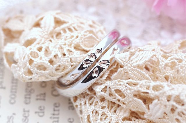指輪の表面に、お二人のリングを重ねると桜が一輪模様が浮かび上がるデザインのオーダーを頂きました。