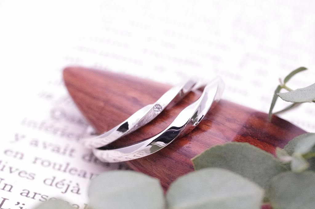 ひねりのデザインにカット面を入れるというプラスの加工をなさった、こだわりの詰まった素敵な結婚指輪です。内側にはお二人のイニシャルとお子様のお名前を刻印致しました。刻印の追加も出来ますので、またのお越しをお待ちしております。