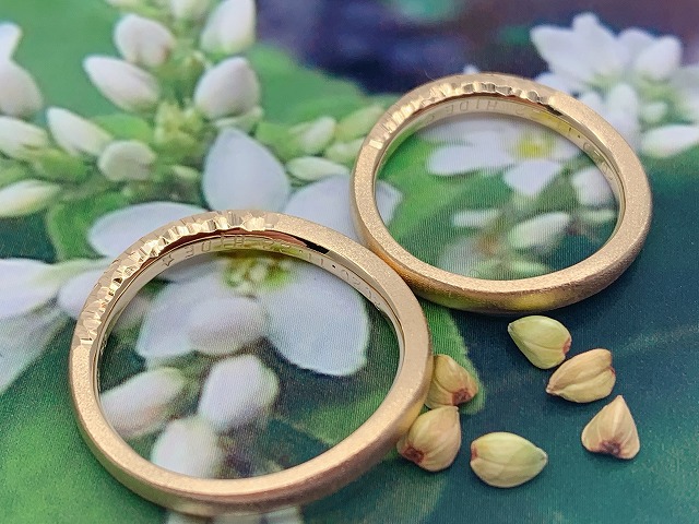 創業50周年を迎える老舗のお蕎麦屋さんご夫妻のご結婚指輪には、サイドにソバの実をモチーフとしたデザインのテクスチャを入れて、表面にはソバの花を彫らせていただきました。つや消し加工の落ち着いた地色によく映えて、お二人らしいオリジナルの指輪となりました。大変喜んでいただけてスタッフ一同嬉しく思っております!